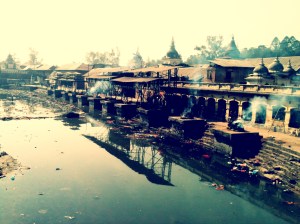 The main religions in Nepal are Hinduism and Buddhism. This is a Hindu temple and the smoke rising up in the air is from bodies being cremated, their ashes are then placed in the water as part of their belief system transitioning them into the next life.